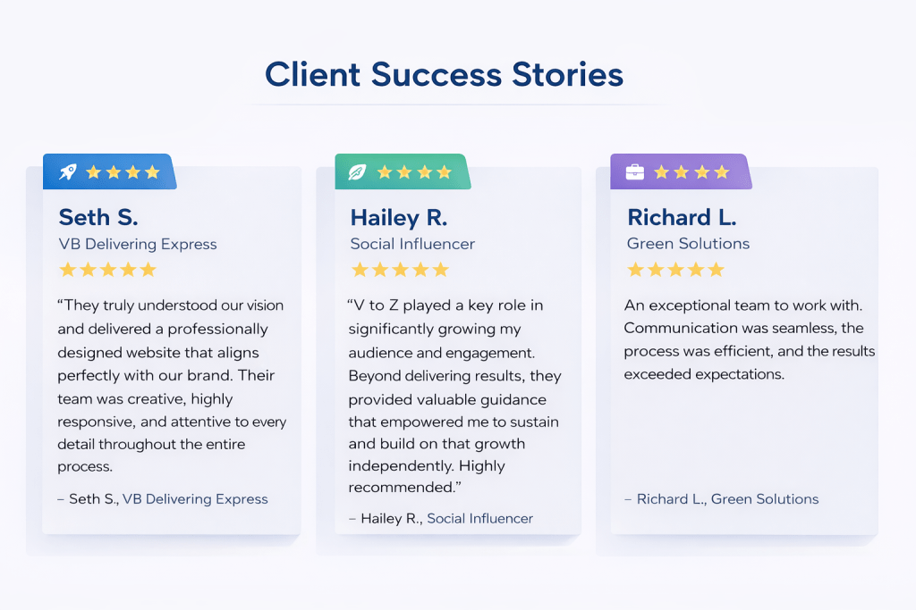 At V to Z Marketing, one size fits all marketing isn’t an option. Every business has unique goals, challenges, and audiences. That’s why strategies are custom built for your brand. Focused on execution, measurable performance, and delivering results that truly drive growth.